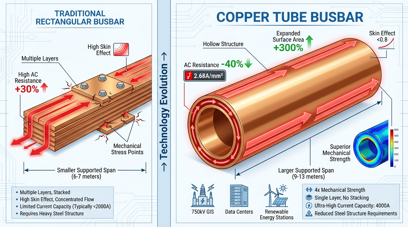 Haec revolutionis structuralis directe alloquitur dolorem puncta transmissionis ultra-magni currentis. In 750kV switchgear gas-insulate (GIS), a Φ100×5mm busbarum aeris tubus currens 4000A ferre potest, cum densitate currenti solius 2.68A/mm². E contra aequivalentes busbars rectanguli requirunt plures reclinant stratis ducens ad augmentum detrimentum supra 30%. Magis critico, vis mechanica tubuli busbarum aeris quadruplex est busbarum rectangulorum. Sub brevi-circuitu currenti impulsum 50kA, palmus suspensus 9 metra attingit, et palmus fultus ad 13 metra pervenit, significanter necessitatem substationis ferro structurae minuens.