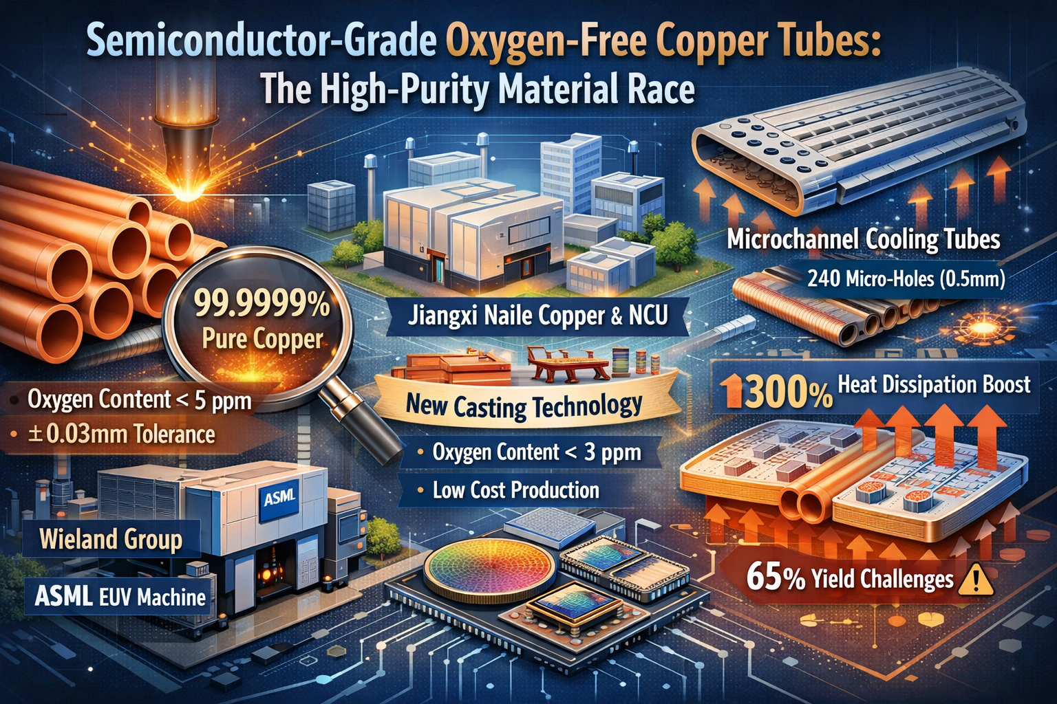 Breakthroughs in cost-effective alterum exstare. Jiangxi Naile Cuprum, in cooperatione cum Universitate Nanchang, "extremum oxygenium ultra-humile fissurae methodi horizontalis continuae fundendi" moderatur quod oxygenii contentum infra 3ppm ad unum et octavum sumptus modos vacuos importatis. Haec innovatio copiam catenae in lineas productionis SMIC ingressus est. Provectiores applicationes includunt laganum-level refrigerationem fistulae cum microchannel designs (v.g., 240 Micro-foraminibus 0.5mm diametri) augendae caloris dissipationis efficientiam per 300%, quamquam cedunt rates provocatio ad 65% manent.