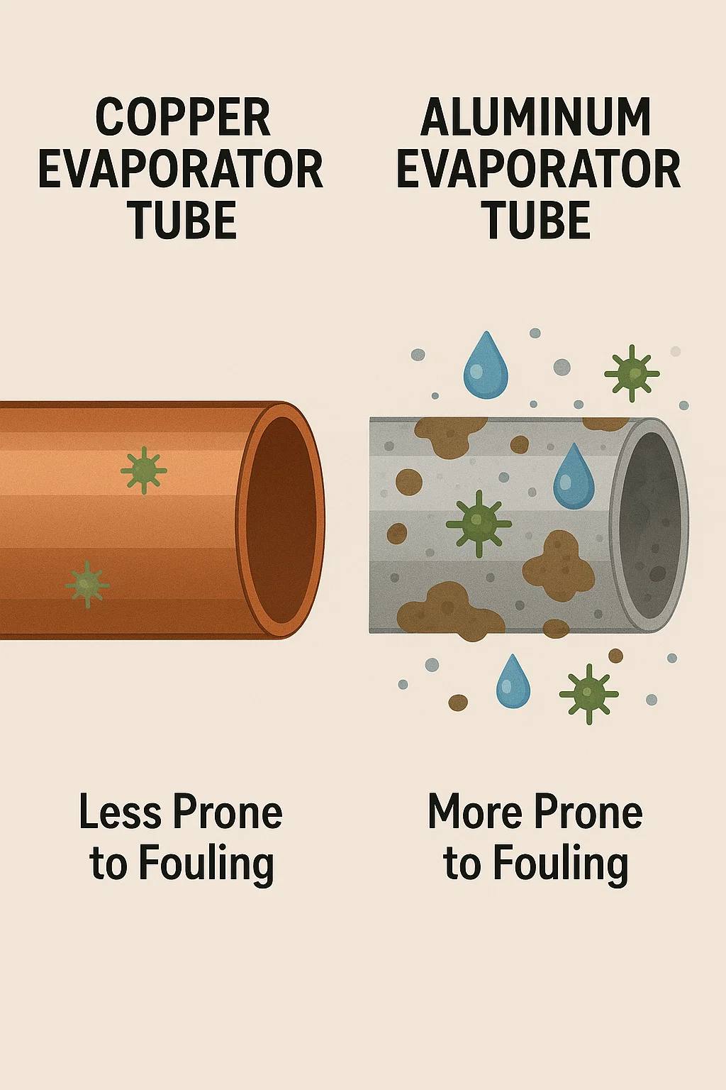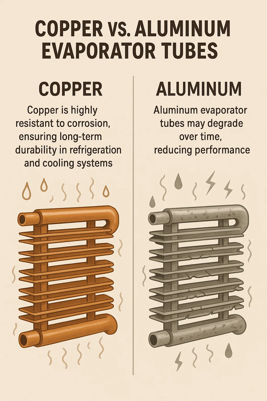 aluminium levius est et flexibilius quam cupro, sed hoc etiam significat minus esse laedi ab externis copiis resistendum. In ambitus altum pressurae, aluminium evaporatorium tubi magis proniores sunt ad denting, rimas, vel inflexiones, quae perficiendi et longitudinis vitam committere possunt.