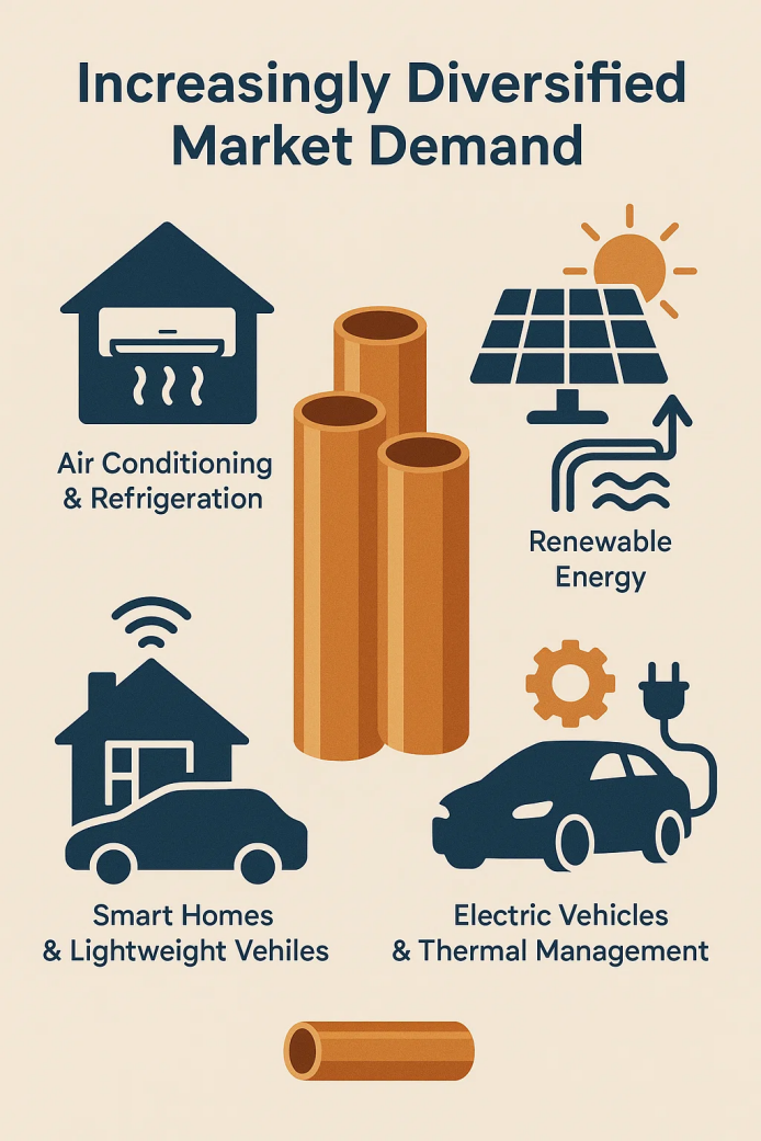 Cum accelerato progressionem dolor domos, lightweight vehicula et electrification, applicationem missionibus aeris fistulae sunt etiam expanding. High-perficientur aeris tubulis non solum core components pro condensers et evagoorators in domum adjumenta, sed etiam ludere a crucial partes in scelerisque administratione systems of novus industria vehicles. Hoc foro expectat ut permanere crescere.