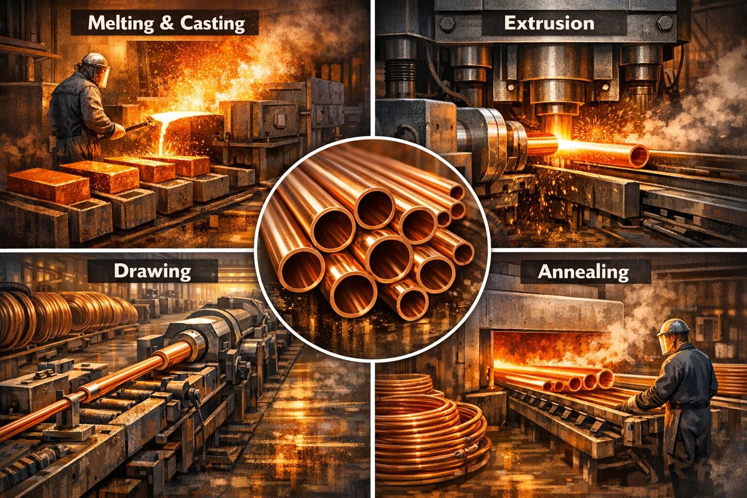 Omnia cruda incipit aes, saepe 99,9% pura. In cor tubuli aeris officinas, fornacibus massivis hoc aeris temperaturis superfluis liquefactum est 1085°C . Metallum cum liquidum est, in solida trabes quae "tabulae" appellantur. Cogita de his esse crayons gigas, qui tandem in millia Tubingarum tenduntur.