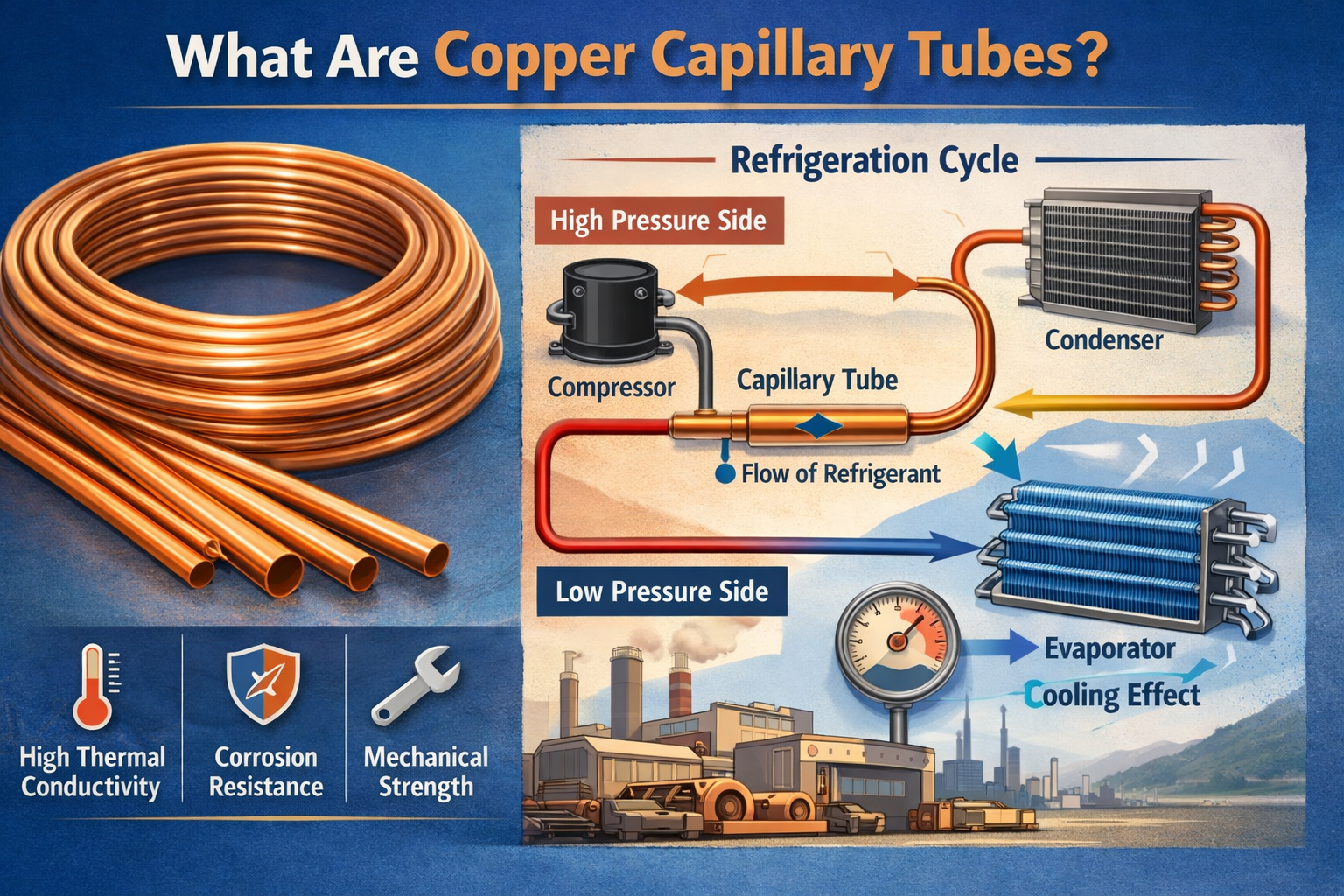 Systema refrigerationis essentialia sunt in hodierna vita, a conservatione cibi et medicinae ad consolationem nostror *um domorum et operum conserveta. Una e elementis praecipuis quae harum systematum efficientem invigilant operationem, est capillaris fistula . Inter varias materies pro tubulis capillaribus; cuprum probavit eximiam electionem ob singulares eius proprietates.