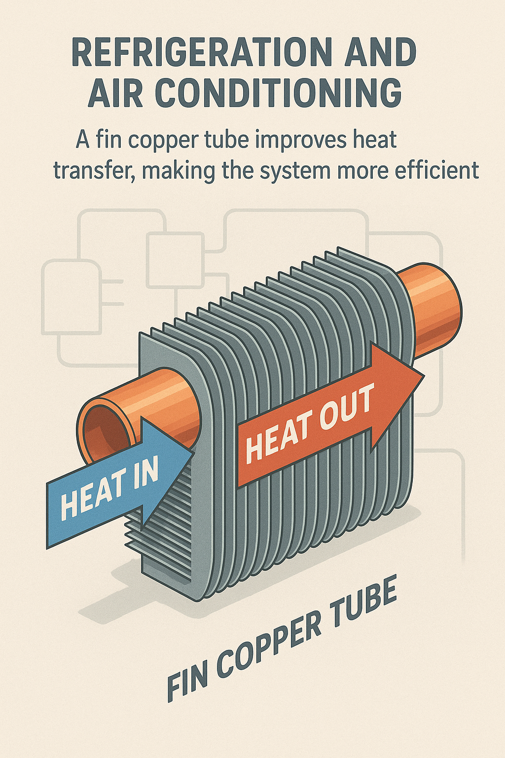 In systematibus caeli condicionibus, Fin Cupperi Tubes late in evapora- toribus et gyris condensioribus adhibentur. Evaporator calorem ab aere intra aedificium haurit, condenser autem calorem ad environment velit emittit. Usus Finis Tubuli Cupri in utroque harum partium melioris altioris caloris transferendi efficientiam, ducit ad melius refrigerationem perficiendi et energiae inferioris consummationem.