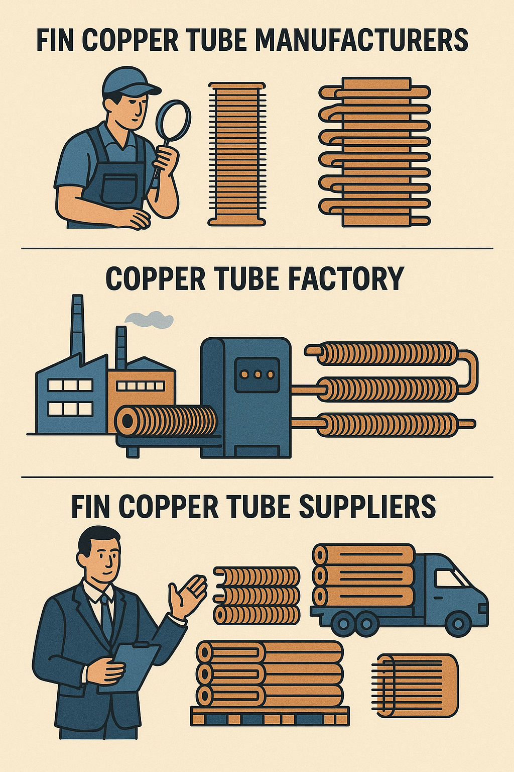 Proprietates singulares Tubarum Fin Copperi eas aptissimas ad varias applicationes in utroque refrigerationis et aeris conditionis industrias faciunt. Hic sunt usus frequentissimi;